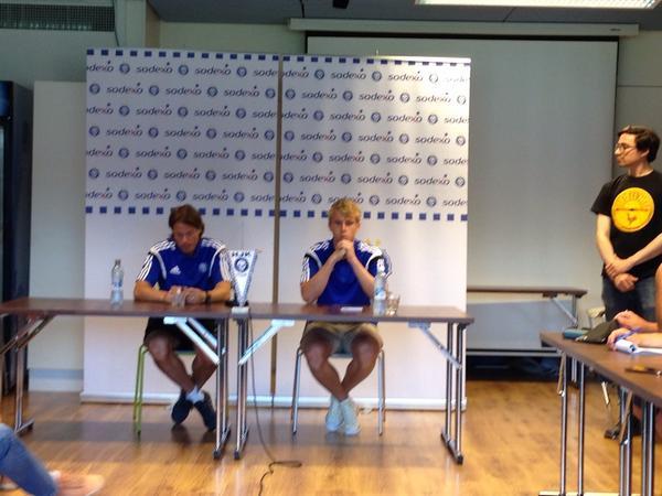 Η Δημοσιογραφική διάσκεψη του προπονητή της HJK Helsinki Mika Lehkosuo, έχωντας στο πλάϊ του τον ποδοσφαιριστή της ομάδας του, τον R. Schüller, στην αίθουσα διασκέψεων του σταδίου. Sonera